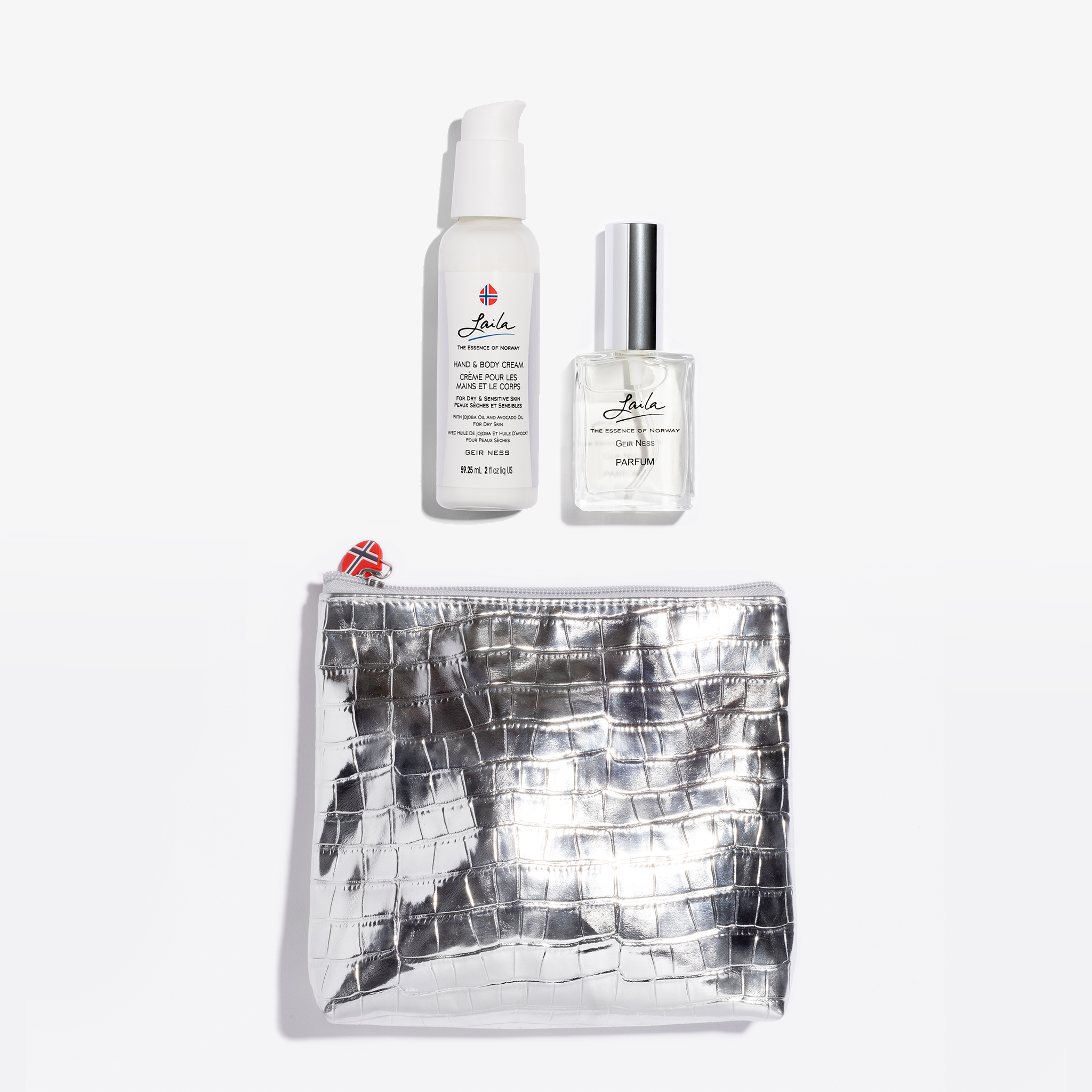 The silver faux croc exterior closes with our signature zipper emblem, adding an optimistic pop of color against the shiny surface. What’s more, Skien comes loaded with travel-size Laila Hand and Body Cream and Eau de Parfum Spray.