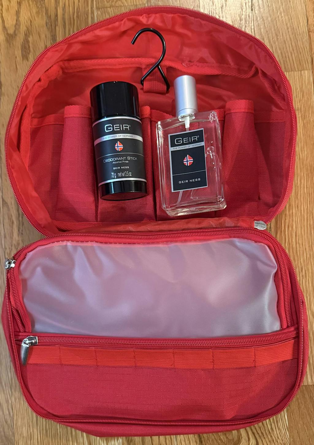 Designed by Geir Ness himself, this handsome and durable travel case is water-resistant and includes a handy hanging hook and three individual pockets to organize your toiletries and offer protection from leaks.