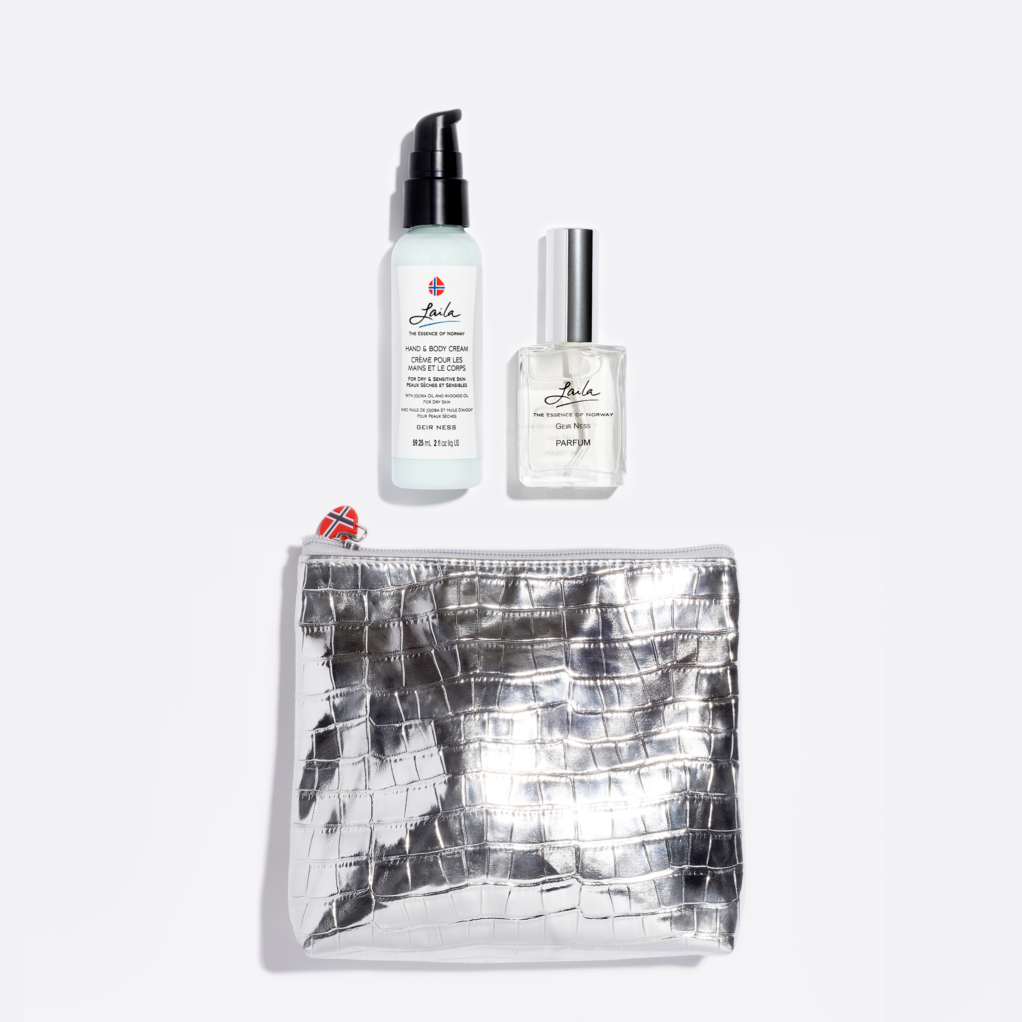 The silver faux croc exterior closes with our signature zipper emblem, adding an optimistic pop of color against the shiny surface. What’s more, Skien comes loaded with travel-size Laila Hand and Body Cream and Eau de Parfum Spray.